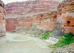 South Canyon and Vasey's Paradise Day HikeAugust 1995Part of a quick 4-day trip, I drove up to Vermilion Cliffs, Az to visit my friend Alan Dannenberg, who at the time was living there and working as the maintenance guy for the motel. Besides the obvious things that need to be taken care of at a motel, he had the challenging duty of maintaining the water supply to the motel. The supply begins at a spring up at the 4500' level in a canyon behind his place (below), then comes down the canyon via 2" galvanized to a tank outside the compound. The run is over 3 miles long!