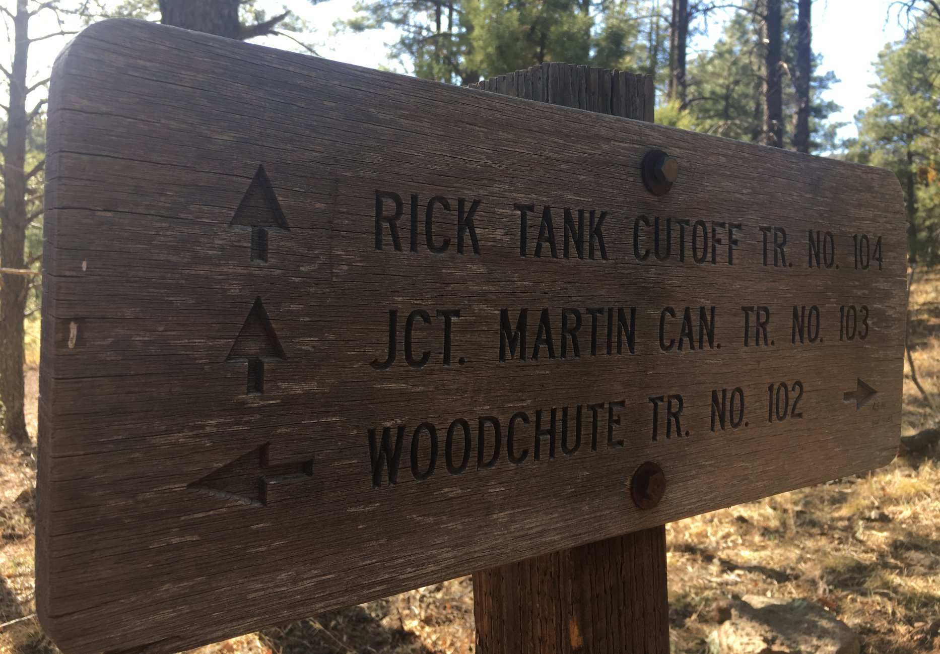 After passing the Woodchute Wilderness sign (sun on the wrong side, couldn’t get a good picture), a little ways further there’s this sign. Continue following the TR-102 route up to the right and east of the fenceline. The steepest pitch is about there, from the 7400 to the 7600 contour.
